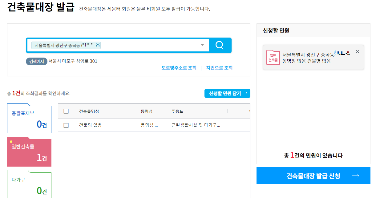 - 건축물소재지, 대장구분 등 입력 후 민원신청하기