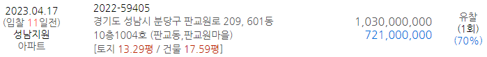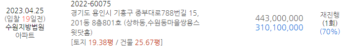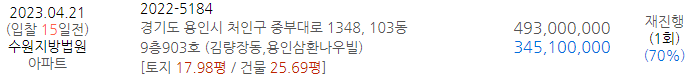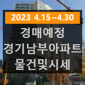 | [낙찰결과] 4월 1,2주 경기남부아파트 물건 및 시세 (0) | 2023.04.15 |
