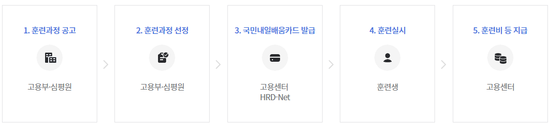 국민내일 배움 카드 발급 후 희망훈련과정을 신청 및 수강하면 훈련지원비가 발급받은 카드나 계좌에서 차감됩니다.