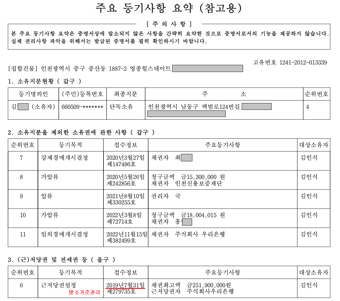 이제 "말소기준권리"를 찾아볼까요? 말소기준권리를 찾으려면 등기부현황에서 [저당권, 근저당권, 담보가등기, 압류, 가압류, 강제경매개시결정 등기] 중에서 가장 빨리 등록된 권리를 찾으면 됩니다. 이 물건의 경우 갑구의 압류, 가압류와 을구의 근저당 중에서 2019년 7월 31일 설정된 근저당이 가장 빠른 권리이네요. 너무 길어서 한눈에 확인이 어렵다면 등기부등본 마지막 페이지인 주요 등기사항 요약(아래 그림)을 보시면 조금 더 빠르게 확인이 가능합니다. 그래도 찾기 어려우시다면 소개드린 무료 경매사이트의 정보지에서도 말소기준권리를 표기해 줍니다. 바르게 되어있는지 등기부등본을 통하여 확인만 해주세요.