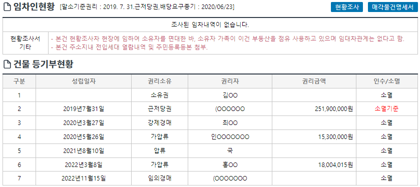 앞선 글에서 공유 드린 무료 경매 사이트에서 물건을 클릭하면 상기 그림과 같이 소멸기준(말소기준권리)을 표시 해줍니다. 위의 경우 2번 근저당권이 말소기준권리이며 낙찰이 되면 가장 먼저 배당을 받게 됩니다. 그 이후에 설정된 3번 강제경매, 4번 가압류, 5번 압류, 6번 가압류 등에 대해 배당 잉여액이 있다면 순차적으로 배당은 받게 되지만 권리는 소멸하게 되는 거라 배당을 받던, 받지 않든 간에 낙찰자는 신경을 쓰지 않아도 되는 권리입니다. 한마디로 내가 낙찰을 받으면 부동산에 잡혀 있던 모든 권리들은 빨간 줄이 쳐지며 모두 등기부등본에서 사라지게 된다는 의미입니다.