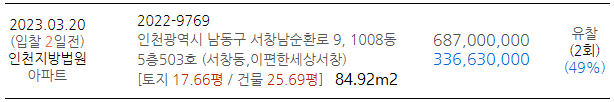 | [낙찰결과] 3월 1,2주 인천아파트 경매결과 및 시세 (0) | 2023.03.18 |