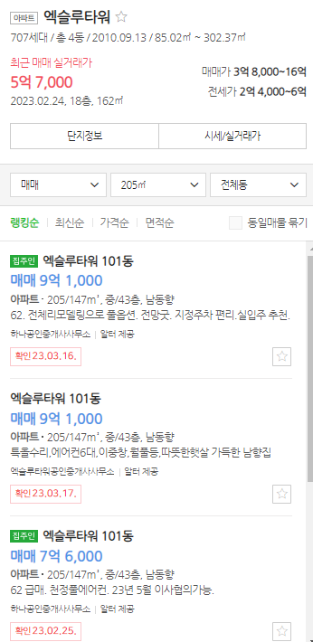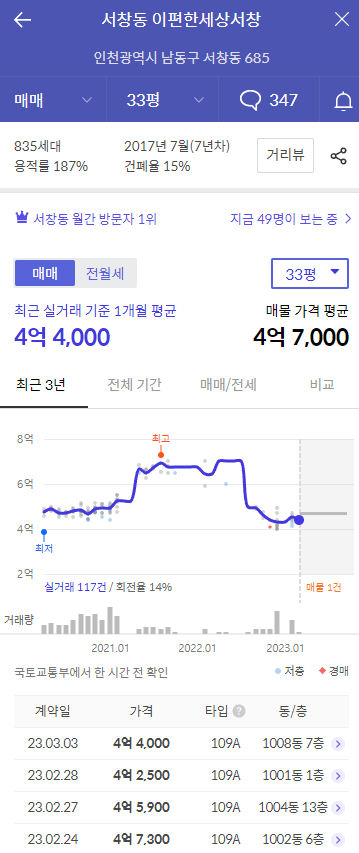 - 특이사항 : 60평대 최근 실거래 없음. 49평대 2023년 실거래 5.6~5.7억